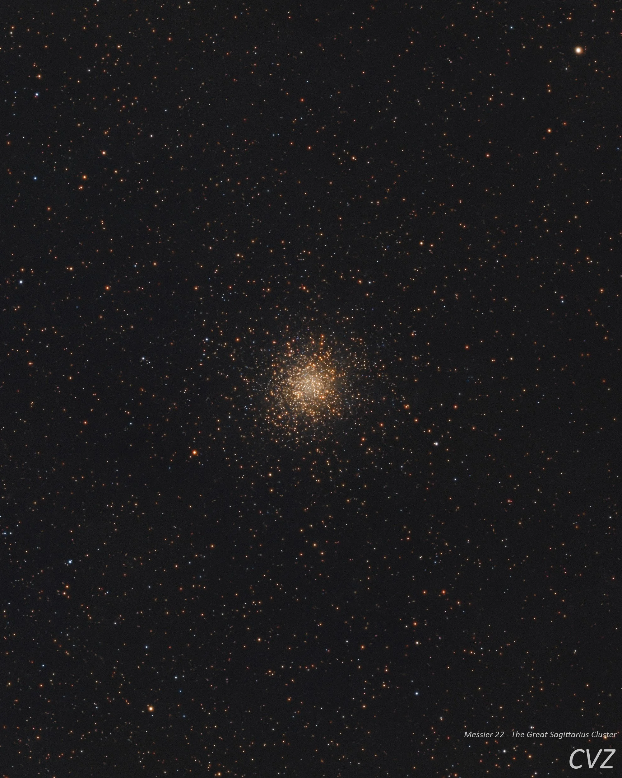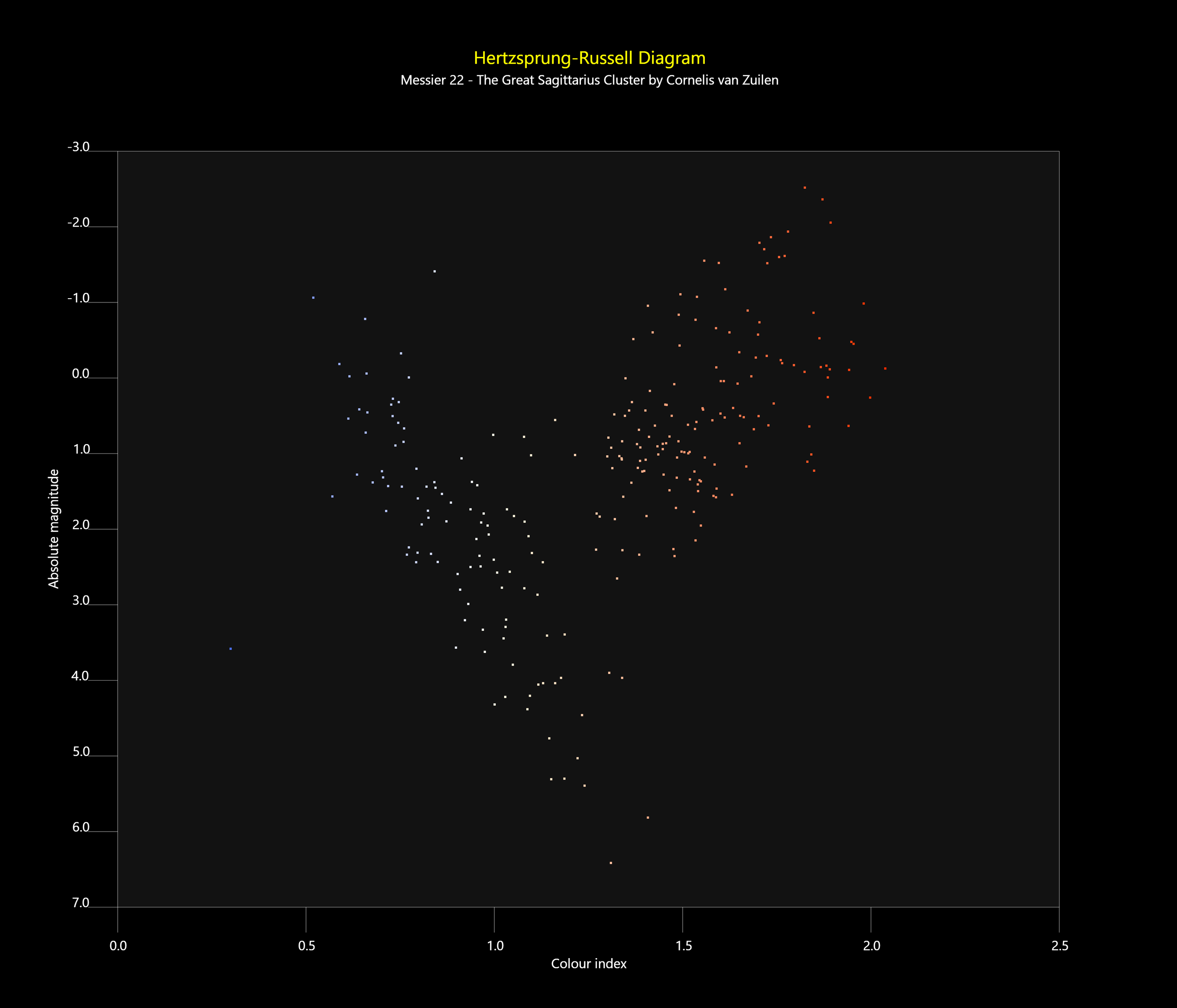 Messier 22 is the second closest globular cluster to Earth, with M4 being the closest. This globular cluster is located in the constellation Sagittarius. It is known for containing many old giant stars, which are visible in the Hertzsprung-Russell diagram I made of it, more about that below.