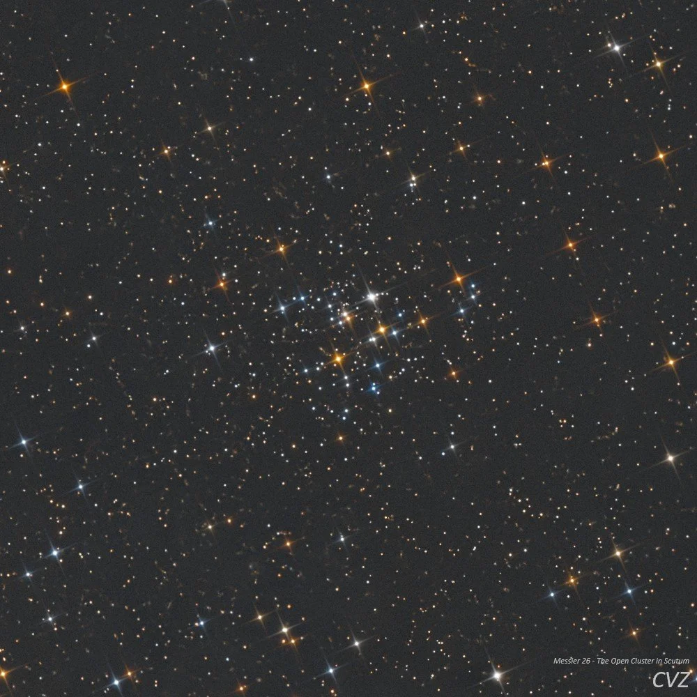 Messier 26 is known for being the faintest open cluster in the Messier Catalog. With an apparent magnitude of 8.9, it is not visible to the naked eye. This open cluster is located in the constellation Scutum, at a distance of about 5,000 light-years from our Earth. Because of its low brightness and its location near the core of the Milky Way, it is quite difficult to find with for example, a DSLR camera or binoculars. Luckily, I use a telescope equipped with an ASIAIR that can do plate solving, so locating it was not an issue for me. Finding the time to capture it during my Messier Marathon was a bigger challenge.