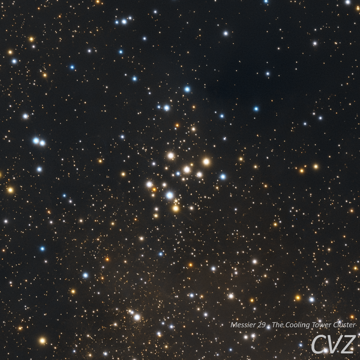 Messier 29, also known as the Cooling Tower Cluster, is located in my favorite constellation, Cygnus. To be honest, I have no idea why it is called the Cooling Tower Cluster, but there is probably a logical reason behind the name. Before 2018, its distance was estimated to be around 5,200 light-years from our planet, but more recent publications based on Gaia DR2 and EDR3 data place it at a distance of roughly 4,000–4,500 light-years.