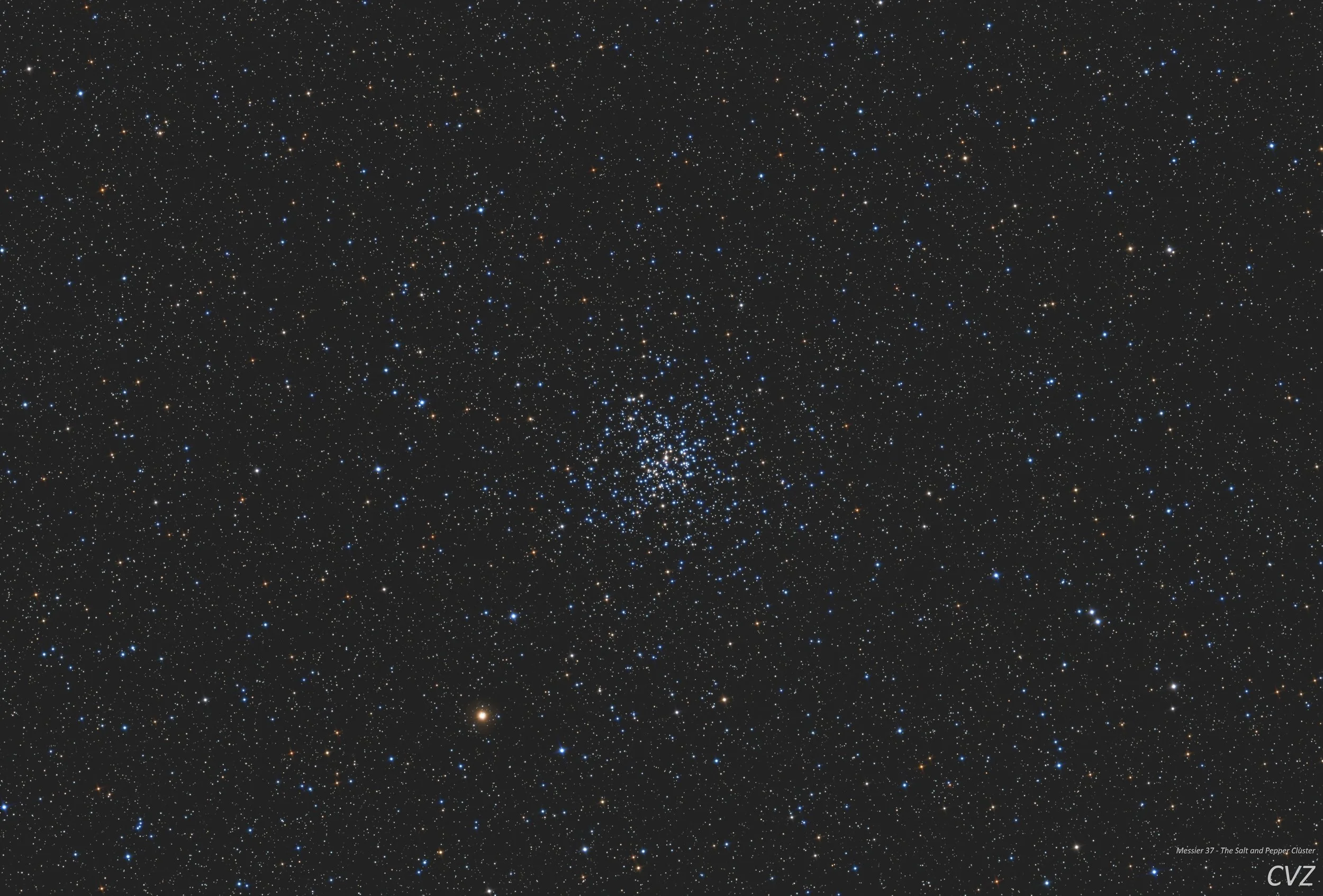 Messier 37, also known as the Salt and Pepper Cluster, is an open cluster in the constellation Auriga. It was discovered by the astronomer Giovanni Battista Hodierna sometime before 1654 and was later rediscovered and cataloged by Charles Messier himself in September 1764. The cluster is located at a distance of about 4,500 light-years from Earth. Compared to some of the other open clusters I have written about, Messier 37 is a big boy, containing around 500 stars. In addition to numerous B-type main sequence stars, the cluster also contains several red giant stars, which are less commonly seen in many of the younger open clusters in the Messier catalog.