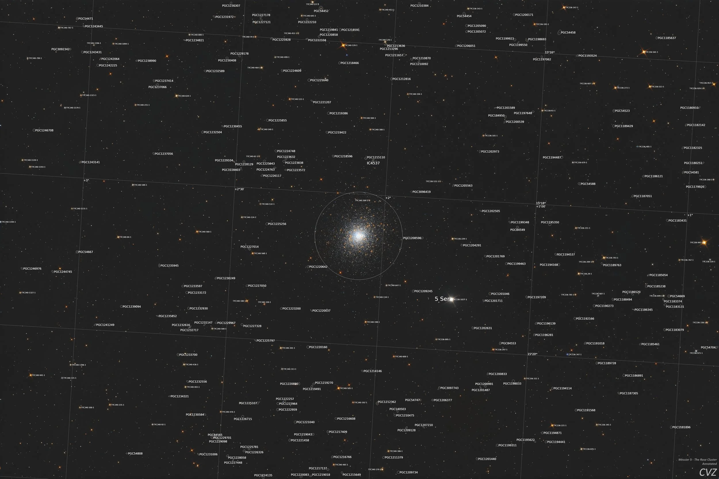 The fully annotated version of Messier 5 - The Rose Cluster in Serpens
