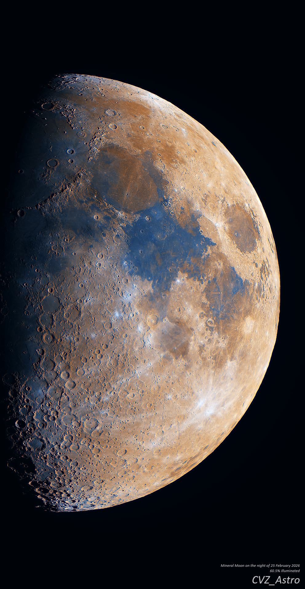 Back in October 2024, when I last photographed the Moon, I experimented with making a mineral moon by saturating the colours of the image. The goal was to reveal the subtle blue and orange hues caused by variations in lunar surface composition. Unfortunately the result was far from ideal. Instead of distinct mineral regions, the image had a lot of unnatural purple and green gradients. Today I finally discovered the source of that issue. The colour gradients were introduced by the program I use to center individual frames before stacking: Planetary Imaging PreProcessor (PIPP). Because the Moon was already well centered in this recent dataset, I decided to skip that preprocessing step and proceed directly to stacking. The difference was immediately apparent.
